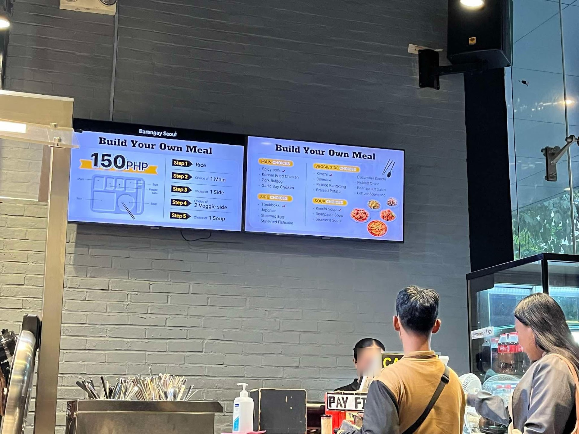 When you first approach the restaurant, it’s clear it’s packed, with most chairs filled. At just 150 pesos for a full Korean meal, it’s no wonder there’s a lot of interest. There are plenty of tables, including outdoor seating, tall tables, and medium-length tables for larger groups, yet it’s still almost full. The design is appealing, particularly the studio lights on the ceilings and the mural of a Cebu map highlighting "BARANGAY SEOUL" in bright yellow. The atmosphere is lively, but it can get quite noisy due to the crowd.