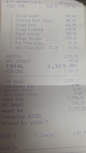 Read moreI have been to this restaurant & it's main branch @ the Gallery, along the old San Jose de la Montaña Rd, several times. Their food is like home cooking. The one (1) bad thing about this restaurant & it's branch is the fact that they don't give full senior citizen discount of 20%, even when you present the card issued by OSCA. You have to ask them how they compute the discount, before they give the government approved 20% discount for senior citizens. It is really discouraging, because unless you ask for the computation, they get away w/ not giving the full 20% discount. Very...