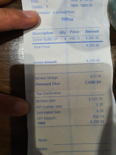 We reserved for a traditional Thanksgiving dinner. When we arrived at 6:20pm, they were hacking up the barebone remains of a turkey and we figured ok, the next one will be coming up. Nope. They only cooked one turkey. ONE TURKEY for an advertised Thanksgiving meal!!! There were no mashed potatoes, no stuffing, no cranberry sauce, and now not even any turkey. I don’t have the words to describe how disappointed we were after looking forward to this little bit of home during our travels in the Philippines. Management really messed up with this one. The staff were all very friendly, the poor waiters were apologetic, even though it wasn’t their fault. The restaurant itself was very nice, the selection of foods was good, although many were not kept warm (think cold spaghetti, cold pizza, cold meat skewers…). I don’t know, I don’t honestly think we’d make any special trip...