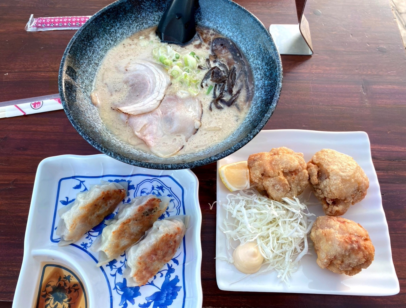 Ambiance of the place is good, the service was okay. The food was decent. We ordered Tonkotsu Ramen, Gyoza, and Karaage Chicken.