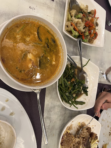 We picked this restaurant because of its atmosphere, but as for the food, lets just say any random street food or restaurant in Bangkok would taste twice better than here. I highly suspect they just hired some inexperienced cheap young chef to make those dishes. We ordered seafood salad, Tom yum soup, fried rice, and fried chicken dish. The best one is the fried chicken. The fried rice so wet and sticky just make it a little more sticky it'll pass for a sticky rice dish, and its not flavored enough. As for the Tom yum soup, not exactly sure what ingredients are missing, but it doesn't taste like any Tom yum soup I've tasted in Thailand or anywhere else in the world. DO NOT trust those photos in the menu, they look nothing like the real things. They probably use AI or photoshop to heavily edit their dishes. As soon as the dishes were served on the table, I could immediately tell I was in for a big surprise. If youre a traveler tired hungry desperate for some thai dishes dont mind for mediocre none-authentic thai food while enjoying the atmosphere, maybe this one is for you, otherwise you should probably just walk around the plaza for 5 min youll find better restaurants next door with money better spent. Three stars because of the atmosphere, otherwise it...