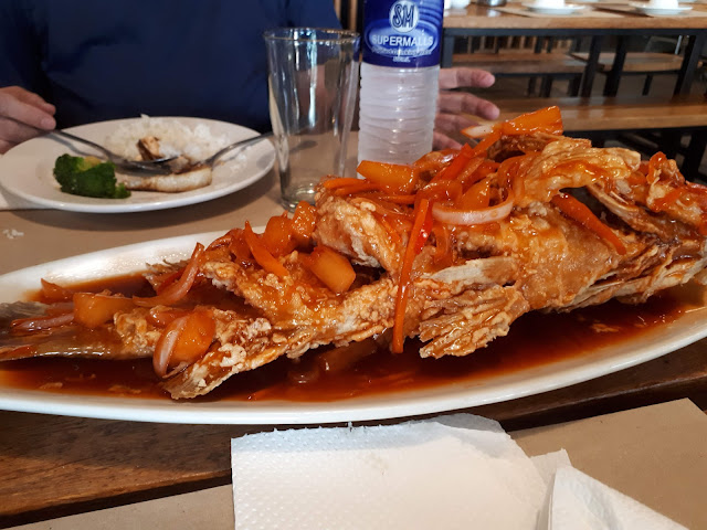 We ordered a grilled tuna collar (a huge one!), squid adobo, sinigang soup with four big clams (live when we picked them), and vegs pinakbet. (You could tell we were hungry.) Great presentation. Great taste for the tuna collar and squid adobo. Nothing memorable about the rest. Overall --- four stars for the food. It was rather pricey. Paid an amount comparable to what I would have paid for a decent lunch for two here in Vancouver.