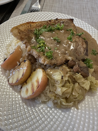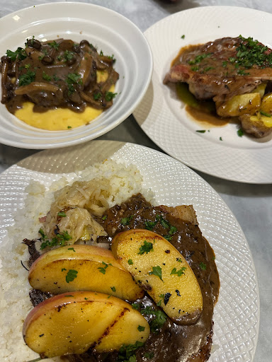 MAINS: The Salisbury steak and pork chop were both tasty. Our favorite was the roasted chicken—the sauce was amazing even though the serving size was pretty small for the price. Unfortunately, it was initially served undercooked. While they replaced it and eventually offered it for free after our multiple follow ups, the wait took too long.