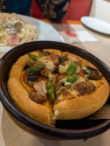 The food is actually quite good. I'm surprised so Pizza Hut. it's been a long time since I haven't eaten here. the service is so so good. the stuff are very friendly. there was there's only few people so the order was fast. the atmosphere is also good, but I guess it needs a bit of maintenance. the utensils and cups were obviously old as well, so maybe Eugene's replacement and but aside from that food and service it's good. so overall we...
