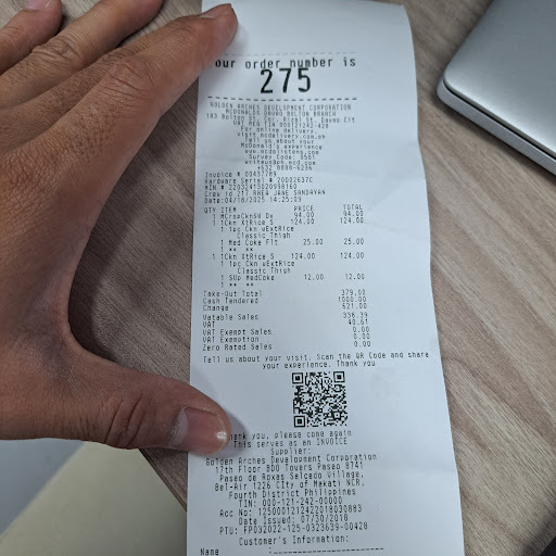 Ā Ā Ā Read moreI don't know why out of all the mcdonalds in Davao, this one was the worst. There was only one cashier taking orders so the line was very long. The cashier herself looked like she didn't want to be there because you can see the expression on her face as she looks at you like you're the one inconveniencing her for trying to provide an order. She clearly doesn't know the menu because upon asker her if the Ala king was available, she responded yes but when my order was served to me, i got the basic chicken fillet without any sauce, not even gravy. I also ordered fries and didn't get ketchup. There were no ketchup available for some reason but the person after me got a couple of ketchup packets on her tray so I don't get why they didn't provide me with any. The experience was miserable. I hope the other branches...