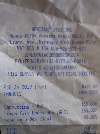 Read moreI was here from the airport waiting for a business meeting when I realized that I had left my mobile in the taxi I had come in. The mall was still closed. I told the staff, Sharlene, who got and served my coffee. She told Mon, another of the morning staff, who asked if I had any details of the taxi. I got a slip provided at the airport. Mon was on a mobile (personal I think) and then on the phone line. After a few minutes, they had tracked the taxi service. He got my phone number to call the mobile to confirm if a unit was found. In less than 45 minutes, the taxi driver was back with mobile.
