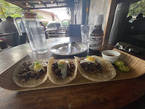 Read moreLocal fare fused with creative culinary touch. Sisig taco is a fusion of Filipino and Mexican dish combining roasted pigâs cheek meat and carne asada. These starters are really filling and went well with my ice-cold SMB Pale Pilsen. The grilled blackened salmon fillet on top of flavored sticky rice was really good. Topping it with soy sauce tamed its fishy taste. I was tempted to finish the rice but I have noodle plate to take care. The stir-fried noodles, bathed in soy sauce and other condiments, topped with smoked pork belly sprinkled with onion greens and spices is a new twist to a typical âpancitâ offering. I would say not bad at all on the new twist. And they were gone! Iâm pretty satisfied and needless to say, âsuper-bus ogâ. Will surely come back and this time will try their famous tiramisu.