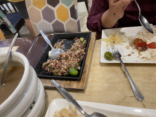 My husband and I enjoyed the spicy nilagang baka soup. Thatâs all we could enjoy, really. We ordered grilled bangus, mixed veggies (chopsuey) and sisig. I didnât try the bangus, it didnât look appetizing I feel so bad for my husband who ordered it. The mixed veggies tasted sweet like, did they mix up the sugar and iodized salt while seasoning it? They told us in advance that chicken is not available so they will put Chinese sausage in it instead so that also added to the sweetness of the mix veggies. In fairness, the bell pepper in it was cooked al dente so I could eat that. Iâve never had that dish taste so sweet itâs so bad. The sizzling sisig didnât sizzle and it was so mushy it felt like I was eating it rawâalthough I know it was cooked because some of the jowl that was in it was a bit crunchy. I had to eat it along with rice to tolerate the slimy sensation in my mouth. What happened to this restaurant? It used to be so good when they were at the Al fresco area at the back. Oh and one other thing: My husband was trying to get their attention so we can get and pay the bill. He said theyâre trying so hard to not look at you so you wonât ask them anything. Or if you do lock eyes with them, they would look...