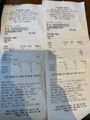 My partner and I rushed to Starbuck Dumaguete to continue working. The place was good but the experience was horrible. I originally ordered a VSCCB (my drink) and Iced Honey Almond milk(for my partner), but my partner's order isn’t available. So I just ordered mine instead. The transaction was smooth the first time. Then, my partner decided on a drink, so I went back to the counter and ordered an Iced Caramel Macchiato then went back upstairs since there were a lot of people waiting. Technically, I got another receipt since it was 2 separate orders.