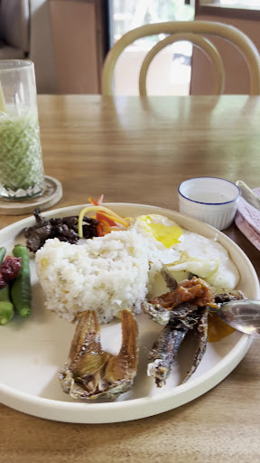 2.) On my second visit, I tried the Full Filipino Breakfast, a real feast of flavors! It had the perfect crispiness of dried danggit, a creative twist on sardines, okra with a special bagoong, a sunny-side-up egg, and tasty tapa, all paired with flavorful garlic rice. It also comes with suka (vinegar) that ties all the flavors together. Surprisingly good!