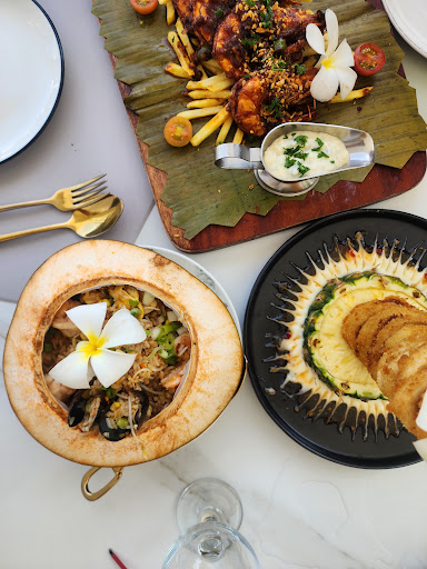 Seafood Rice in Coconut The seafood rice served inside a young coconut is a true culinary masterpiece. The dish is a visual feast: plump shrimp, tender mussels, and fragrant rice garnished with tropical flowers. The flavors perfectly blend the natural sweetness of coconut with the savory, umami notes of seafood, creating a memorable and exotic dining experience. Every bite transports you to the sea.