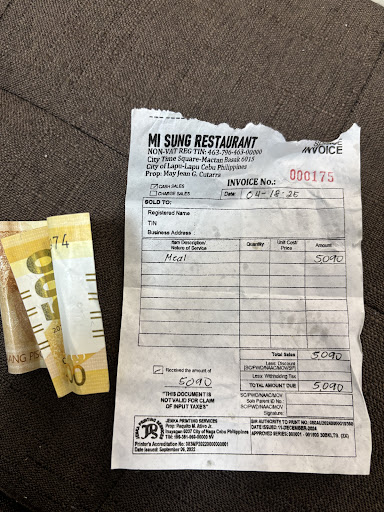 My total bill came to 5,090 pesos. I handed over 6,000 pesos in cash, and the waiter returned only 410 pesos in a small basket. They had done a great job, so I initially told them to keep the change as a tip. However, something felt off, and out of confusion regarding the short change, I politely asked for the receipt again.