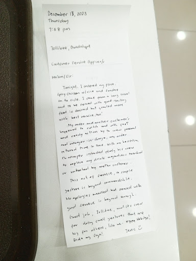 I handed over the copy of my receipt and written letter to another manager-in-uniform at the counter, exchanging smiles with her as she receives it.