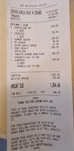 First, I ordered a cappuccino with an extra shot. The regular cappuccino (which includes two shots) was reasonably priced at 158 pesos. However, the extra shot alone was charged at 138 pesos – the same as a full double-shot espresso in a cup, which also costs 138 pesos. That pricing makes absolutely no sense and feels like a rip-off, Other premium cafés in the same area, an extra shot costs just a fraction. When I asked the manager if this was an error or some kind of joke she simply said she couldn’t do anything about it. Well, that’s customer service at its finest – especially when facing a justified complaint.