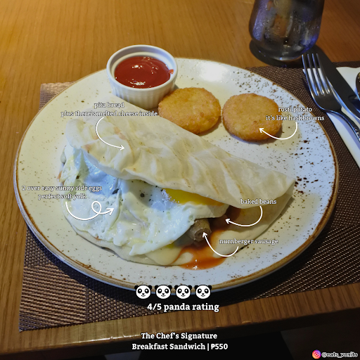 ➢The egg white omelet was too oily. Same with the asparagus. The mushrooms and tomato were okay. ➢The chef’s signature breakfast sandwich was delicious. The sunny side eggs, even though it’s a bit oily, had perfect runny yolks. It paired really well with the baked beans and nurnberger sausages. I really liked the rosti potatoes, it had the right amount of crunch and tasted even better with ketchup. ➢ The iced hazelnut was just okay. ➢ The complementary bread and butter were great; the soft bread paired perfectly with the butter.