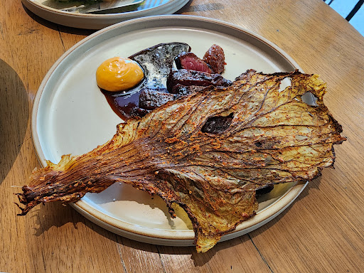 The Steak Bavette (Flank Steak) was disappointing as well. They had a korean theme for the dish with gochujang and kimchi flavor to pair with the steak. The steak was cooked medium and was soft, but for me it lacked flavor that the sauces did not bring. The gochujang emulsion didn't have much taste as it tasted too light. The steak sauce was weird tasting and bitter. Then the leaf on top is like a kimchi and with some chili paste to bring spice. It didn't taste satisfying and I did not want to finish the dish at all. I just forced myself to eat it.