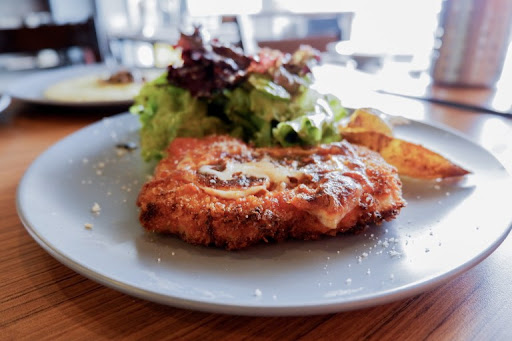 Chicken Milanese (P550) â deep-fried chicken breast battered and covered with crumbs topped with tomato sauce and mozzarella cheese, with lettuce and potatoes on the side. We find the fillet a bit thin and wished it was bigger for the price.