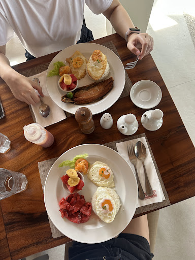 We sat on the second floor, which was peaceful in the morning, as most guests were likely at buffet breakfasts elsewhere. It was a nice spot to enjoy our meal.