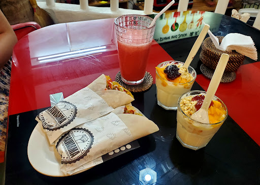 The food I had here was so yummy!!! I was tired, hungry, and was looking for something to eat. I knew I wanted to try the fruit and yogurt so I stopped by this location again. While at this location I ended up getting the chicken shwarma, a watermelon shake, my mango yogurt with nuts and strawberry jam, and a waffle cone with chocolate and vanilla ice cream. EVERYTHING was sooo good, my wife and I were very pleased and will be returning. The yogurt was nice, fresh, light, well balanced. The watermelon shake was a sweet flavorful burst of freshness to the mouth and body. The combination of ingredients for the shwarma wrap requires a nice bite of it to fully enjoy. The ice cream was a nice way to finish the meal with the freshly cooked waffle that smells soo good. I honestly don't think anyone would be disappointed with the...