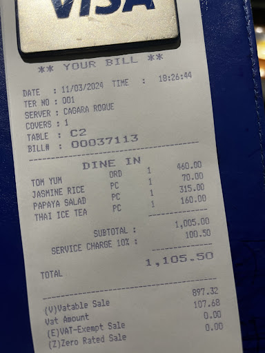 The food was absolutely delicious. The shrimp fried rice was flavorful, perfectly cooked, and generously portioned—comforting and satisfying in every bite. The grilled squid and prawns were another highlight, cooked just right with that smoky, tender goodness that makes you want to order seconds. Everything tasted fresh and well-prepared, staying true to the vibrant flavors of authentic Thai cuisine. To balance it all out, the refreshing coconut was the perfect drink—naturally sweet, cooling, and the best way to complement the savory dishes. It added to the tropical, relaxed feel of the whole experience.