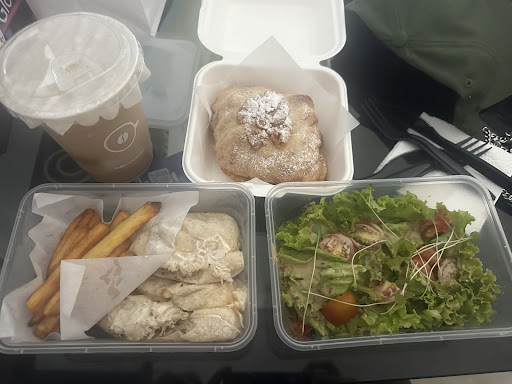 The side salad was saturated in the dressing, making it soggy and a bit unpleasant to the senses. The cereal mango croissant was the best part about the order. I enjoyed the little mango bits inside the croissant, but the almost candied exterior made it a little too rich. The corn flakes on top were also stale.