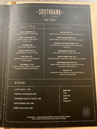Ā Ā Ā Read moreLove me some Southbank Cafe & Lounge. We had the scallop taco, Hainanese Chicken, Korean Brekky dish and the steak and eggs. WOW is the best way to sum it up. Delicious, flavors with depth, soft balanced with crunchy, and portions were ideal (not too big or too little). The cocktails are prepared by Maestro, a magician who knows his potions to please the palate of his patrons. Abbey (charming & hip) created a drink fr scratch based on what I liked (using 3 words) and it was SUPERB. (It is no wonder one of their drinks won in a competition.) And the dessert, so-help-me-God, was addictively scrumptious. It is the Ferrero Loukoumades -- it has the prettiest yellow edible flowers on it, mint leaves and ice cream that does not taste like it just came fr your supermarket. Makes me want to name my child this dessert (ok, my fur baby, if I had one). And to top it off, the service was on point (warm & attentive) and the ambiance has the NYC-vibe my family likes and is used to. Needless to say, this is my go to place now for a wonderful dining experience. Go check it...