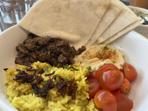 Came plain lassi. To my surprise it's blended iced yogurt! Well more ice and powdered yogurt, next the 7 layered dip. To my surprise it was unflavored and under seasoned! I need to put garlic sauce and hot sauce just to enhance the flavours. After awhile came the plate. Hmm I'm worried already! It came smaller than i thought, the lamb was not seasoned and the meat is grainy and gritty. I thought cheap cuts! The tzatziki was watery, and just about 1.5 tbsp only. The moutabal is same amount, no flavors of tahini and garlic. The tabouleh was dry no flavors of lemon and olive oil. The biryani unseasoned.