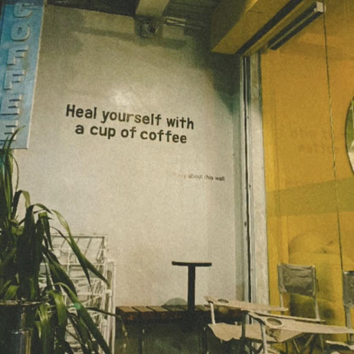 I am in no way credible to talk about design, but their overall vibe is uniqueâmustard walls on one side, bright orange on the other, and striking green in the middle, a bold choice to steer away from the usual white and beige palette. The outside? A simple concrete structure, with "Heal yourself with a cup of coffee" plastered on the grey wall.