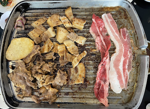 We had the unlimited samgyeopsal. We were initially served with four slices of pork belly cuts with some sliced potatoes, sausages and onions. The pork belly cuts were just fine, ideal for grilling. Banchan were simple just about 5 different side dishes, some are not rifillable. They serve us some mix of lettuce and napa cabbage for samgyeopsal which for me napa cabbage for samgyeopsal is a big no no. The serving size of banchan were only good for one person so you'll have to frequently call the staff for refill. Same with pork belly, when we asked for refill we were given one slice at a time even if we asked for additional 2-3 slices. Flooring is quite oily, they should give it a good...