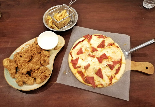 They have the best pizza in town, we always come back for more! They have 9'' and 11" in size . They also have great drinks to choose from, from hot beverages to cold ones. I love their caramel frappe and garlic chicken. The place is ok but it's not as chill as other coffee shop. They also have wifi connection in the past months but I don't why they don't have...