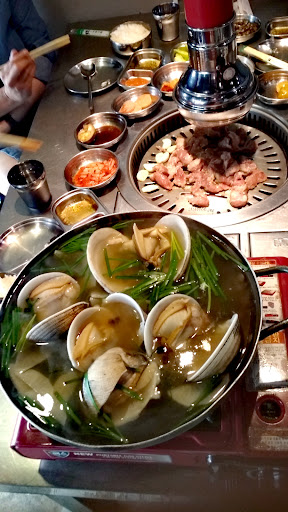Extensive Korean Menu. They have meat cuts that go beyond just pork or beef belly. They have skirts, cheeks, all kinds of cuts you only see on Korean food shows. The choice is extensive. Unlimited iced tea. Lots of Korean Nationals visit this restaurant and would order dishes that were unfamiliar and some not in the menu. Price is reasonable. I always order their clam soup even if it's a bit pricey. Large clams boiled with spices in clear soup. The taste is very similar to a gingery tinola or pesa but I could say this is as authentic a Korean way that clam soup is as I recall how it was prepared in one Korean show. Very filling and refreshing but just a bit tough and chewy so ask the attending waiter to cut the meat of the clams to really small bite size pieces . They have a strong Wi-Fi connection. Efficient service. They pay attention to what the diner needs. There is a complimentary iced coffee drink at the end. Comfort rooms though are just average and needs improvement. The assistance given by the waiters are top notch and will even grill your food for you. Very attentive. Open 24 hours. They accept cash and credit card payments as well. Definitely one of my favorite Korean restaurants...