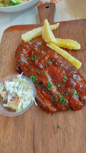 Cajun-style seafood feast. Order your seafood by the bucket. Mussels, crab, lobster, corn, potatoes, shrimp. Choose your spiciness level. Their highest spice level is not spicy, but is flavorful. I highly recommend opting for the garlic butter dipping sauce - largest bowl of garlic better I've ever seen in a restaurant and it pairs with the seafood (and the ribs, and probably the salads & brownies!) very well.