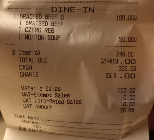 I ordered braised beef for 199 then decided to include a wonton soup add-on that's supposed to be 40 pesos. The person at the counter still charged me 50 pesos. What a mess.