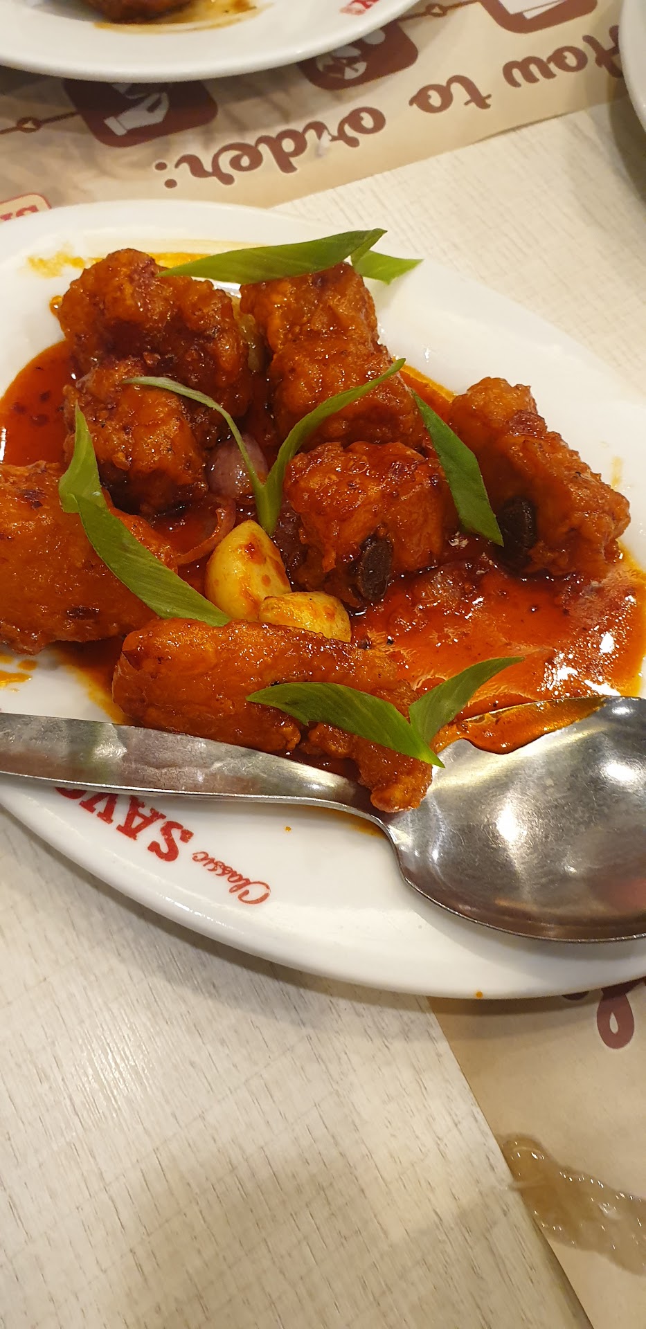The soup was odd. Although the ingredients resembled the traditional chinese soup, it tasted like the sauce on the fish and we could not even taste the spicy component.The chicken was as always, tasted like the one we were so used to. But we had to remind the service crew that it should come with a sauce. The veggies were good but the mushroom tasted like it came from a can.