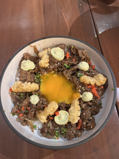 Ippudoâs Gyudon is made of thinly sliced beef yakiniku, mushroom tempura bits, and egg yolk on the center of a bed of rice, in a sweet and salty soy-honey sauce, garnished with spring onions and Japanese aioli.