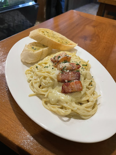 The charcuterie board (₱700) was a small plate with just a few cheese cubes, a few slices of cold cuts, some bacon jam, and a single baby-sized sausage. The truffle fries (₱250) were essentially one potato sliced up — nothing special and poorly executed. They didn’t even bother giving us ketchup or mayo. We had to ask the server.