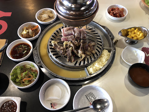 I love this place because they use charcoal grills instead of butane, which adds a fantastic flavor to the food. There are numerous side dishes to choose from, including sweet potato, green onions, fish cake, jjapchae, and pickled radish. We usually start with the beef bulgogi, which cooks quickly and helps curb our hunger while waiting for the thicker cuts like herbed samgyupsal, galbi, and moksal.