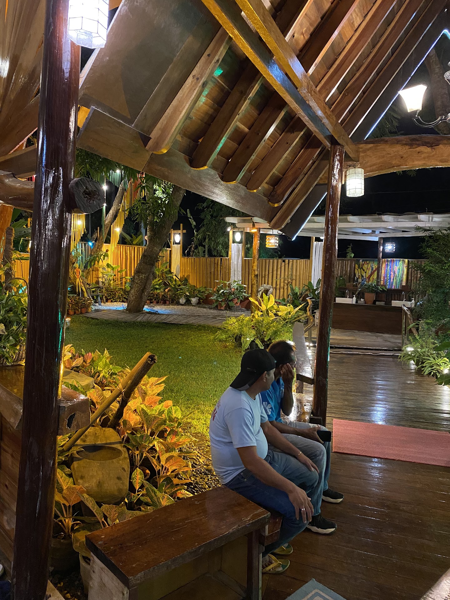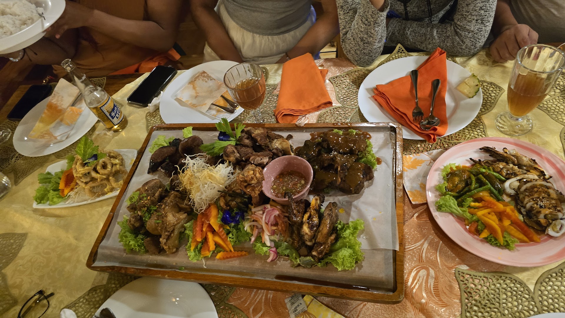 It started rough. We went without a reservation on a weekend not knowing it gets fully booked. A door guy at front said its too crowded and we might not get food on time so we asked if he can take our reservation for tom night and he said he already has something written down in our name. We was super confident as if he owned the place so we thought we were set.Next night...i tried to confirm an hr ahead of the reservation. Only to find the guy at front was not a staff but cud be a trike driver! So we essentially had no reservation. It was our fault for trusting at the front entrance he was a staff and not checking more inside with reception. Thankfully the real staff had a place for us within 10 mins and the food was also really good. We had the meat lover some squid and cheesy torta. Most of my cousins had peanut or seafood.allergy but we got full. Interior was nice too. Just bring some citronella for the legs even a bug zapper wont help you. Also they gave us complimentary desserts of sweet potato balls in choco sauce and watermelon slices. Left a big tip for accomodating us on such short notice fr a grp of 7. Be wary of people at front. Go in and look for staff dressed in white with...