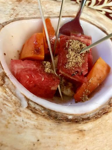 I ordered a Choice Catch of Squid, while the rest of my colleagues shared the Kalui Special of the Day Set. The food, in general, wasnât that spectacular, but it was ok. The Fish Roll in Coco Cream, which came with the set, was notable; it tasted and smelled like some Thai curry. When we finished the main course, they served us complimentary slices of papaya, watermelon, and pineapple, sprinkled with brown sugar, and served in a halved coconut.