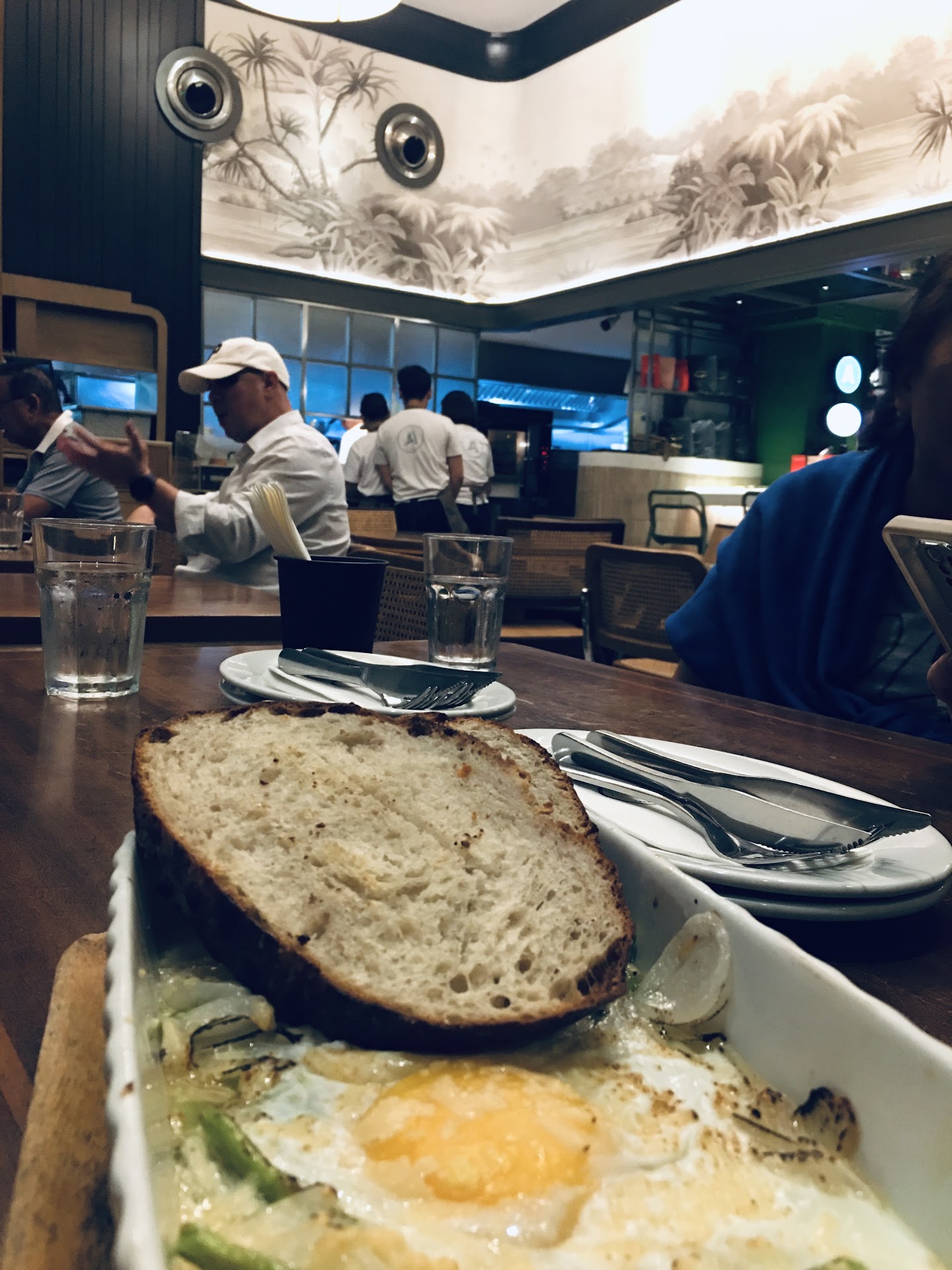 You can park at the basement and it's free. Yey...๐ but it's all stairs if you want to get back up, so it would be wise to drop off your senior citizens before parking. There are several stores you can go to but our target today is breakfast. Note that Rustan's Marketplace here is already open at 7:30am. The place is clean and everything is properly arranged, from tables and chairs and table top utensils. The wait staff are friendly, accommodating and attentive. The kitchen tries it's best to get the orders out for each table, but there is a slow down as more patrons come in. Before we knew it all the tables were already occupied by 9am. They do have outside seating but the heat from summer makes everyone want to dine in the air conditioned cafe, save for the 2 foreigners who opted to enjoy their coffee al fresco. They have freshly baked bread as early as 3am. I think I saw Sourdough, English Muffins, Croissants, and the Pan de Sal. I was surprised when I picked up a Pan de Sal to try it. It has some weight to it at a regular sized Pan de Sal. The crust was not hard and the bread was soft and moist. It was a literal "love at first bite" ๐ in fact, I had two more after my first inspite of having eaten half a muffin. ๐ I love good bread ๐ We shared the steak which was comparable to Mamou's and Wolfgang's at half the price. ๐๐ The hot chocolate is a little bitter but goes perfectly with their bread. I also loved their Duck Confit Arroz Caldo, their version of Chicken Arroz Caldo. The dish was perfectly balanced. Not too salty and you can taste every ingredient contributing to the symphony of flavors (whoa that was way too deep especially for me ๐คฃ) Overall, everything was good, from the service to the food so I'm not surprised why its regularly packed at most times of the day. I would definitely come back to try more of their dishes or to just chill. From the ease of parking (and it's free yey ๐คฃ) and the different retail stores. It's already like a mini mall with free...