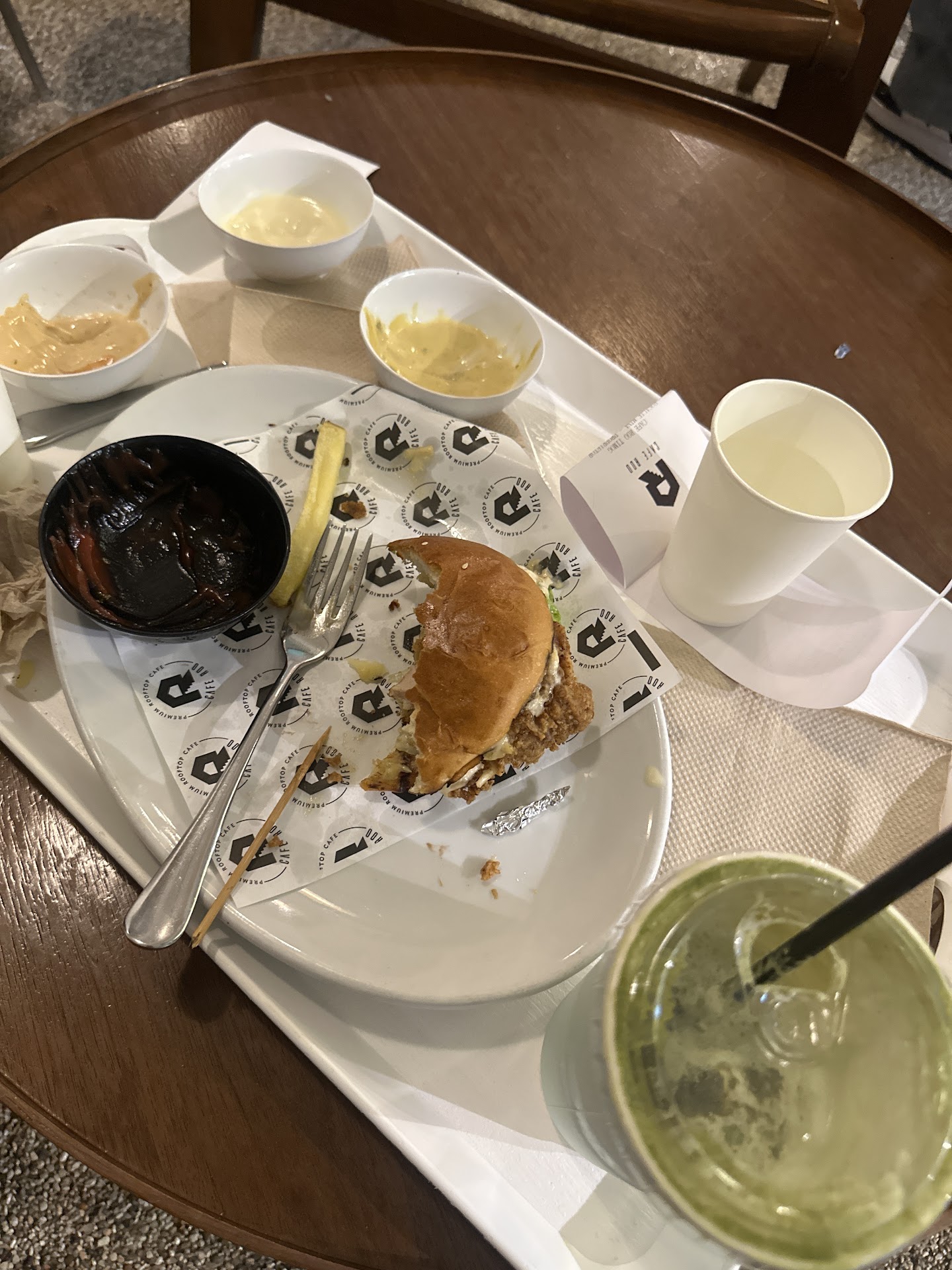 Hence, I reached out to another staff that was also standing by, while the waitress cleans up the cups and tissue papers. When I reached out for my concern, the guy was just silent. He did not say anything, and he just went towards the waitress that I previously asked, whispering something towards her ear. Personally, it was rude for him to not say a single word towards me, regardless of him being a waiter or a bouncer (there is a bar upstairs). In the end, the waitress asked me if it is okay for her to give me mayonnaise or ketchup instead of the chicken burger sauce, and I humbly accepted. After a minute or two, she provided me three different sauces that I waited for so long. Because of that, I knew that it was their service that has an issue.