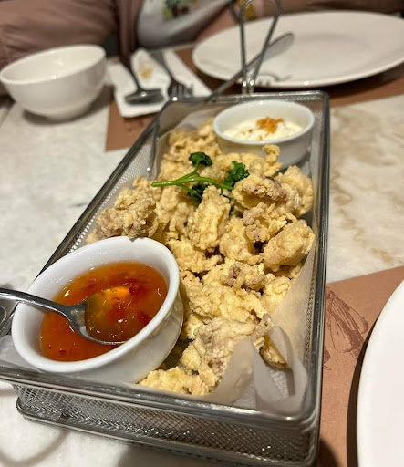 The bottomless kalamansi malunggay juice was refreshing, though the bright green color suggested the presence of food coloring, which I wasn't a fan of. This spot is perfect for family-style dinners reminiscent of Filipino meals at home. We have some favorites, including their unique takes on street foods like the Macaraig and KKK, as well as the calamari served with sweet and sour sauce and a mayo dip. The Lourdes appetizer is a must-order for us on every visit.