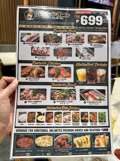 It was our first time in this place. Food was on the average and not worth the price. The "Fantastic Baka" was contrary to the quality of their beef considering we had to pay an additional Php 100.00 at the top of the Php 599.00 (Pork and Chicken selections). The said additional Php 100.00 was for the beef selections, calamari and tempura (seafoods were added as new to their menu) to be included. Adding payment to enjoy beef is highly contradicting for its namesake; bad marketing/promotion I guess. The tempura was promising and that made us really want to try this place for the first time but when we asked for the second serving of our calamari and tempura we were told to wait for 5 minutes for their preparation time and we cheerfully obliged but to our disappointment 30 minutes passed and nothing came, we decided to just enjoy the night for our friend's birthday (no birthday promo,she paid full by the way). For me, the Php 599.00 would be fair enough just having the pork and chicken on their menu. Just avoid the skirt and jowl from the pork and yeah I don't recommend the beef (bad cause it's chewy even thinly sliced) + seafood. Side dishes were average. Drinks (Pineapple Juice, Milk Tea and Red Tea[?]) were free but tastes bland. Not even sure if it was Red Tea since it was just colorful but flavourless. No faucet/washbasin available to wash our hands before and after eating other than from the Comfort Room,which was under maintenance during our visit. Their crew vigorously kept their floors dry since it's slippery rather than refilling/monitoring their...