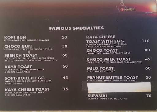 On the high side, If you're looking for a fusion of Singaporean or Malaysian inspired quick bites such as Kaya toasts, coffee crusted buns, soft boiled eggs and bitter drip of roasted coffee with a mix of condenensed milk. Kopi Roti is a place to consider. They also have frappes and iced drinks, tea, barley drinks, dimsum noodles and burgers. The dining area is quiet and suitable for families with kids or couples on a quick date. There is ample parking space around its corner and an alfresco dining option.