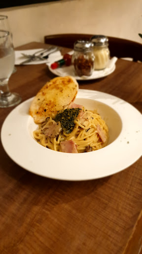 Pesto carbonara - Mia's favorite dish! Noodles are always al dente, the flavor is consistent, the sauce always has the right amount of viscosity ... simply put, delicious.