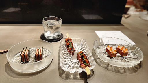 The standout dishes for me were: The Foie Gras with seaweed and strawberry (1 of 3 starters) was surprisingly delicious. The Hamachi with citrus and lime showcased the chef's skill in combining vibrant flavors. The chicken wing filled with caviar rice and dipped in a rich egg yolk sauce was heavenly. (I used the egg yolk sauce with the focaccia bread which was served after). A refreshing combination was the cold somen noodles dipped in a creamy custard sauce, accompanied by ebi carpaccio. I particularly enjoyed the king crab, uni, scallop, ikura fried rice served with a surprise dish, a sous vide Wagyu steak! I also enjoyed the dessert, phyllo pastry with Hokkaido milk ice cream and berries.