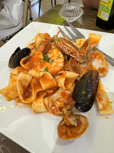 • Pappardelle Con Frutti Di Mare single serving on the picture (Pappardelle pasta with fresh prawns, mussels, clams, fish, squid, white wine and fresh chili in tomato sauce) The server recommended changing the pasta into spaghetti, which we declined that we regretted. Having large pasta meant less for you to share. The taste of the sauce was not acidic and the seafood was cooked to perfection. Be careful with the chili's!
