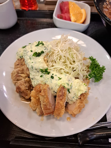 Ramen Chicken Nanban Set 🍜 Kuro Ramen — Black Garlic Ramen w/ tamago and a slice of pork 🍗 Chicken Nanban w/ Rice — loved that creamy sauce on top! Tasted sort of like tartar sauce 😍 🍊🍉 Fruit Slices were served as part of the set!