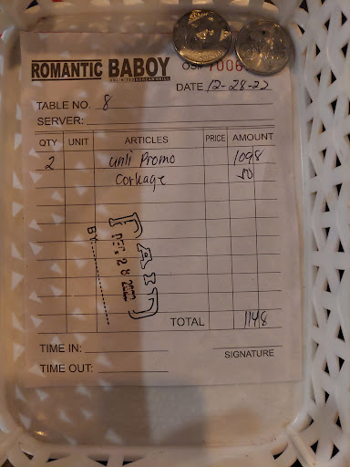 It was around 8:50 pm. The crew approached us and asked about our last order since they were about to close and gave us the bill. We were charged 50 pesos for the corkage, and what's more disappointing is when I talked and explained my side to the crew, she answered me with no manners at all. I wasn't done talking yet when she answered me back, "Ayon sabi ng TL namin, siya kasi nagbibigay ng price."