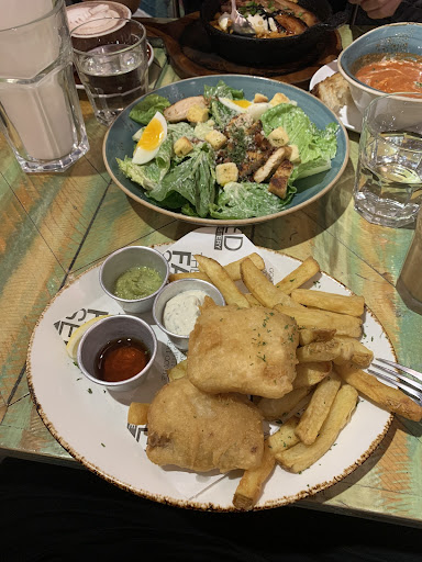 The Caesar Salad presents a classic blend of fresh greens, complemented by the flavorful dressing and crunchy croutons. The fish and chips deliver a satisfying crunch with tender fish inside, offering a fulfilling dish.